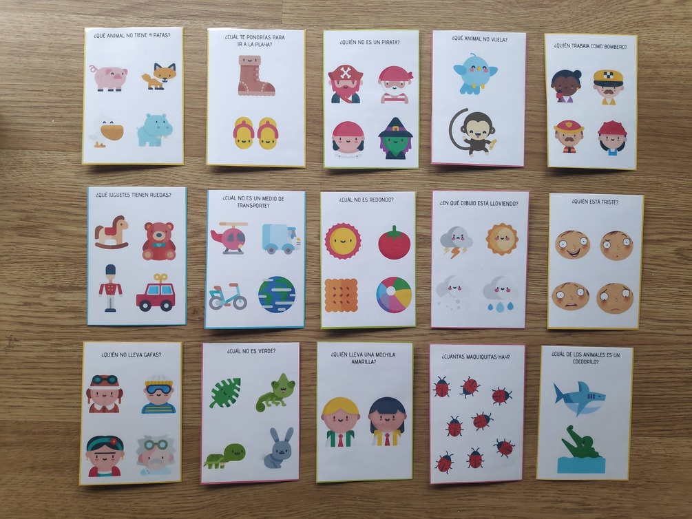 Material con preguntas variadas, destinadas a alumnos de 3 años (+ o -), sencillas pero visuales. Con ellas podremos trabajar conceptos como los colores, los números, las formas, los tamaños, los pesos, las frutas, los animales...un poco de todo, incluida la discriminación visual.