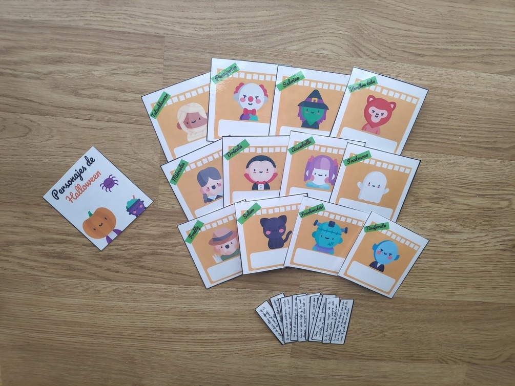 Material con temática Halloween con el que poder trabajar las descripciones y el vocabulario. Con los personajes boca arriba, cogerán una de las tarjetas descriptivas y después de leerla, la colocarán en la cajetilla del personaje correspondiente