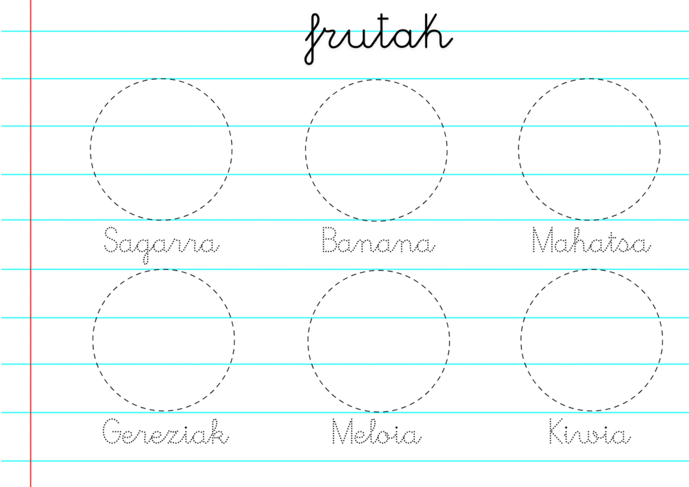 Formak, urtaroak, eguraldia, koloreak, zenbakiak, animaliak, frutak, garraiobideak, lanbideak, arropa, eskola eta etxea. Lehenengo hitzak ikasteko liburuxka, motrizitate fina landuz (belkroen bidez) eta baita irakurketa eta idazketa (hitzak puntuak dituzte gainetik idazteko asmoarekin).
