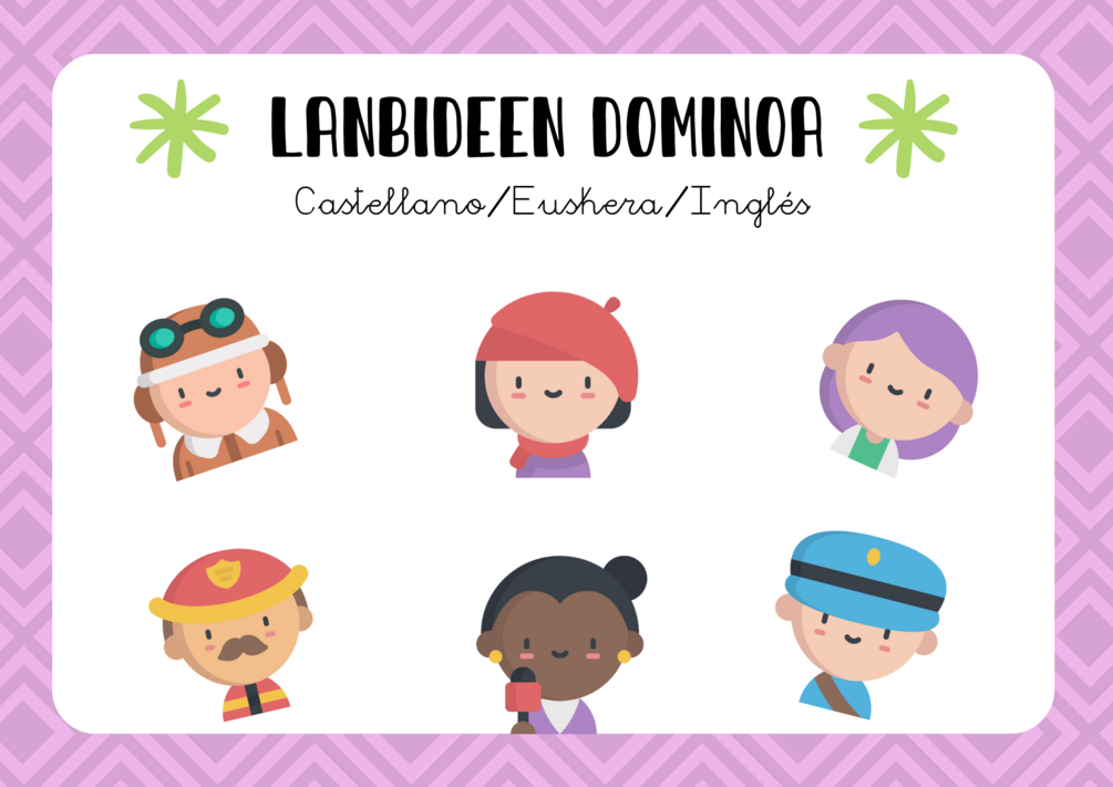 Domino de profesiones en Castellano, Euskera e Inglés. Consta de 36 piezas por idioma.
